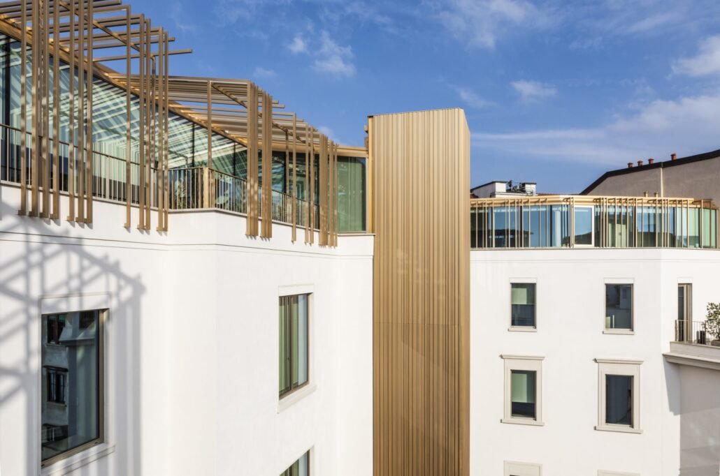 O projeto envolveu todo o edifício: quatro andares acima do solo e do subsolo, um novo telhado para tornar o último andar acessível, a inserção de uma área verde no pátio interno e a criação de um salão de tamanho generoso. Uma cuidadosa restauração foi realizada na fachada da Via Caradosso e nas partes originais. A frente em direção ao pátio foi atualizada e as fachadas redefinidas com uma superfetação na cobertura de altura e acréscimos para os elementos de conexão vertical, criando assim uma ponte de projeto entre os anos vinte do século XX e os vinte dos dois mil, sem interrupção.
