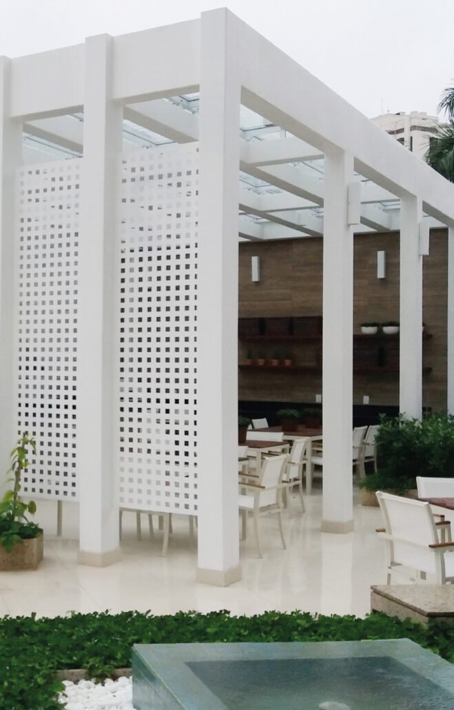 INSIDE 550, residência de luxo projetada pela Cyrela em um terreno de 3.880,00 m², expressa um conceito de design moderno com elegância. Localizado no bairro mais cobiçado da Barra da Tijuca, na península lateral de Oak Hosken, com sua imponente entrada de ferro proporcionada pelo Grupo Gonzato, abre as portas para uma paisagem majestosa. A estrutura da entrada foi criada em ferro cortado a laser e pintada de branco e aço inoxidável. Além disso, o Grupo Gonzato forneceu e colocou todos os corrimãos na área de bem-estar.